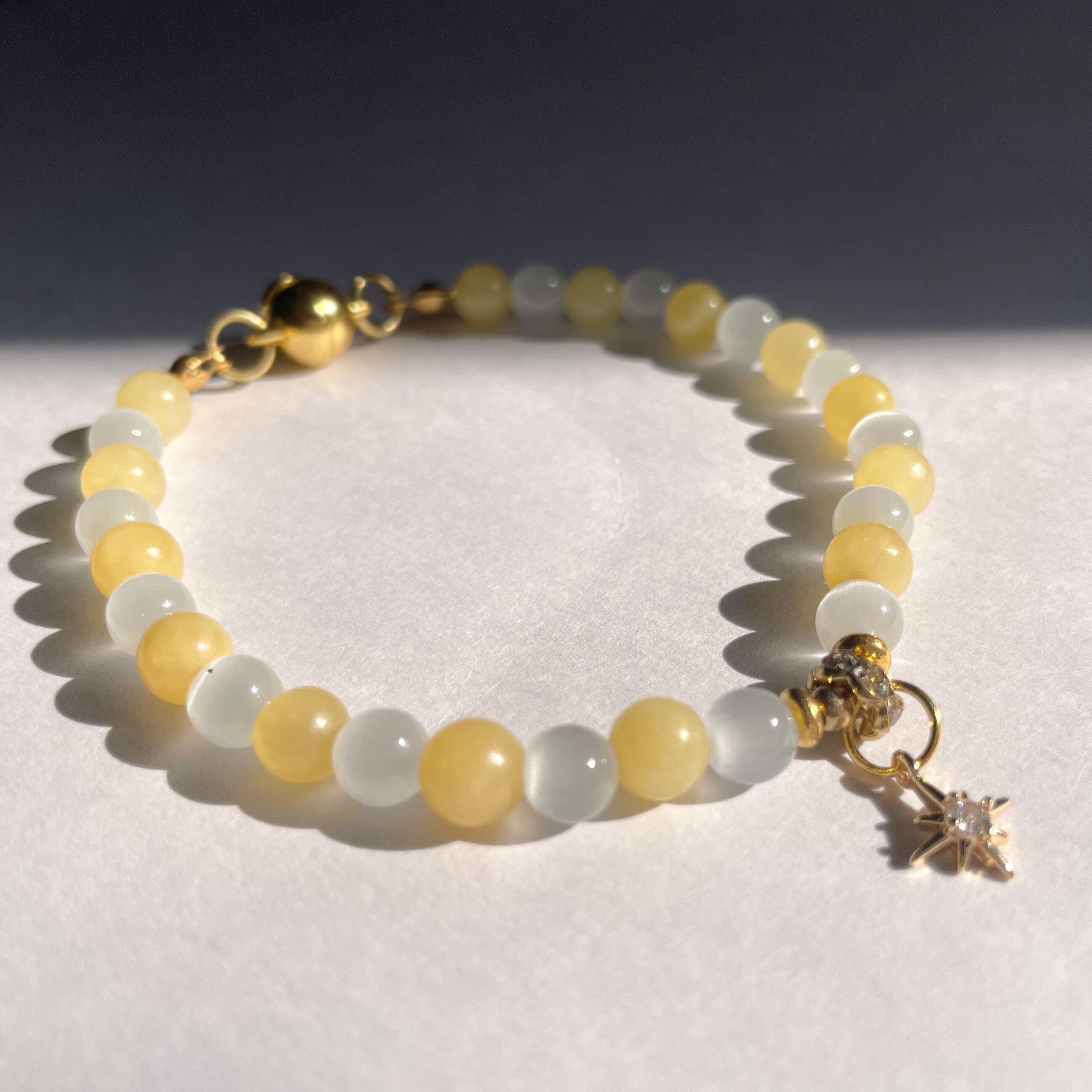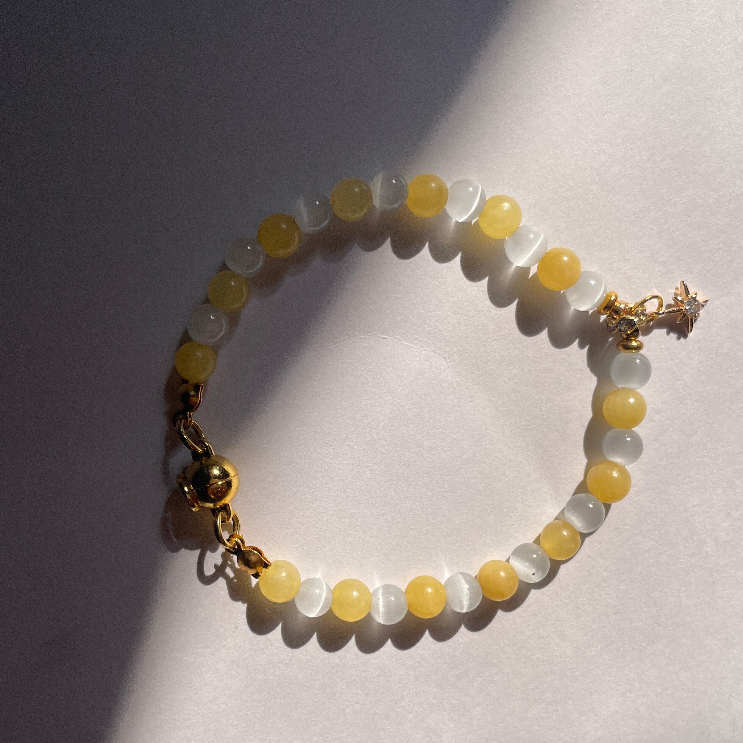 ハニーカルサイトは、感情の起伏を穏やかにし、リラックス効果をもたらします。ムーンストーンは、情緒を安定させ、月の満ち欠けの影響を受けやすい女性の心身を整える効果があると言われています。この二つを組み合わせることで、より一層、感情の安定を促し、心のバランスを整える効果が期待できます。